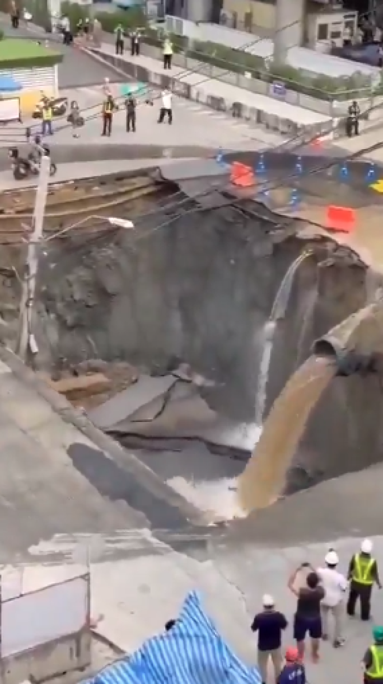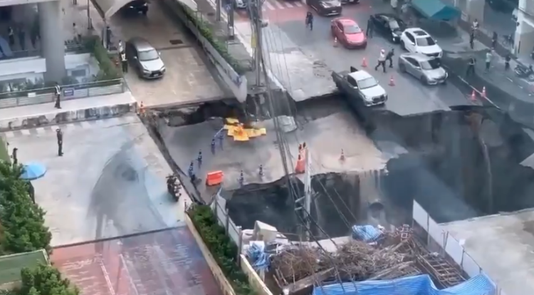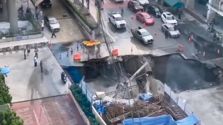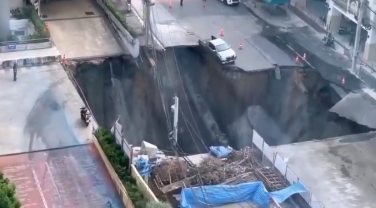 Bangkok''un Dusit bölgesinde yer altı inşaatı sırasında yolda çökme oluştu. Bir anda herkes neye uğradığını şaşırırken çevredeki insanlar ve araçlar panik halinde kaçıştı.