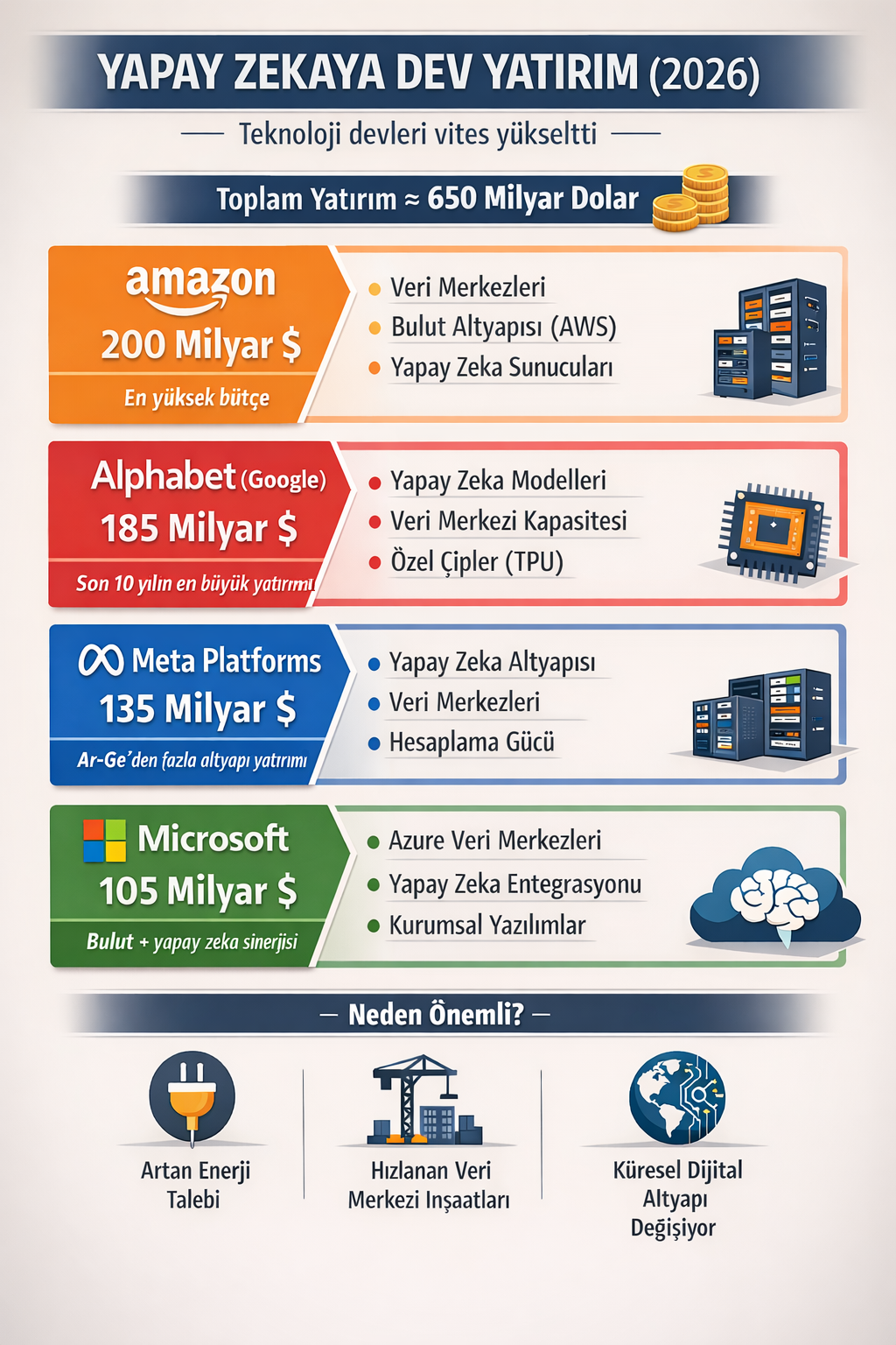 ABD’nin en büyük dört teknoloji şirketi, yapay zekada liderliği ele geçirmek için tarihi büyüklükte bir yatırım programını devreye alıyor. Alphabet, Amazon, Meta Platforms ve Microsoft, 2026 yılı için toplamda yaklaşık 650 milyar dolarlık sermaye harcaması öngörüyor.