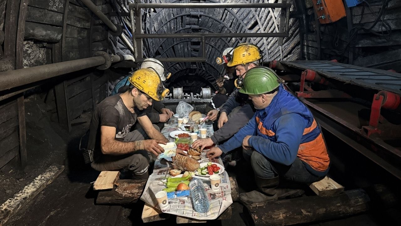 Zonguldak'ın Kilimli ilçesine bağlı Gelik beldesinde özel bir şirket tarafından işletilen maden ocağında mesaide olan işçiler, sahur vaktinin yaklaşmasıyla ahşap direk ve kalaslardan masalarını kurdu.