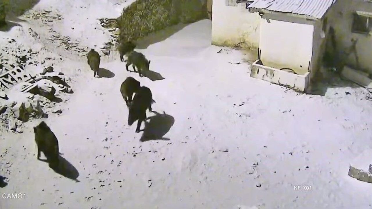 Elazığ’da kar yağışı sonrası doğada yiyecek bulmakta güçlük çeken domuzlar, Baskil ilçesi Hacıhüseyinler köyüne indi. Köyün içerisinde bulunan güvenlik kamerasına yansıyan domuz sürüsü bir süre sonra gözden kayboldu. O anlar güvenlik kamerası tarafından saniye saniye kaydedildi.