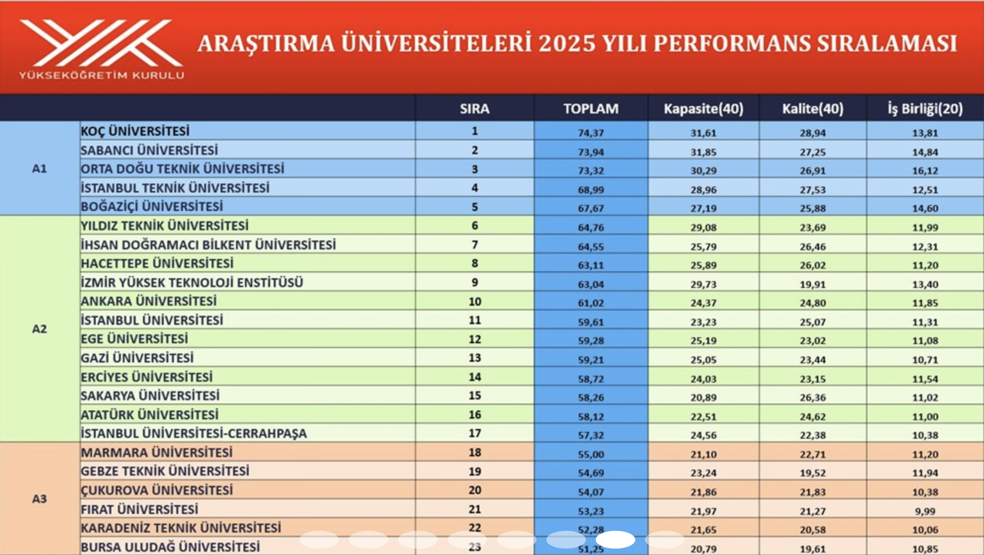 2025 sıralamasında Koç Üniversitesi birinciliğe yerleşirken, onu Sabancı Üniversitesi, Orta Doğu Teknik Üniversitesi, İstanbul Teknik Üniversitesi ve Boğaziçi Üniversitesi izledi.