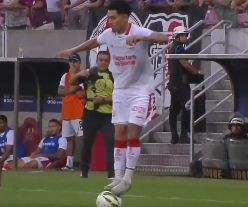 Karşılaşmada ilginç bir an yaşandı: Brezilyalı futbolcu Dodo, rakibini geçmek için topun üstüne çıkarak çalım denedi.
