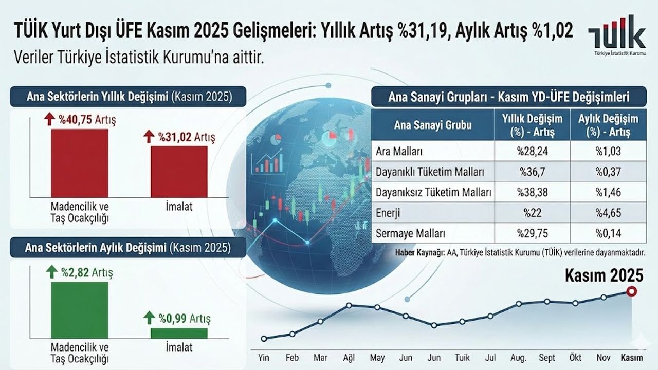 Buna göre YD-ÜFE, kasımda bir önceki aya kıyasla yüzde 1,02, geçen yılın aralık ayına göre yüzde 30,01, geçen yılın aynı ayına göre yüzde 31,19 ve 12 aylık ortalamalara göre yüzde 25,67 yükseldi.