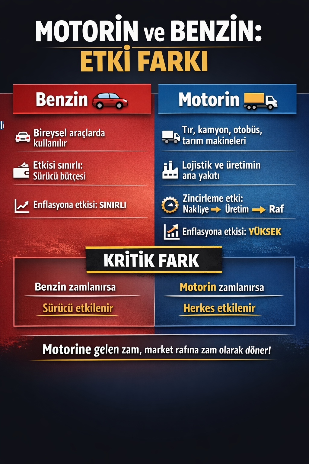 Benzin fiyatlarındaki artış çoğunlukla bireysel araç kullanıcılarını etkilerken, motorindeki yükseliş çok daha geniş bir alanı kapsıyor. Bu nedenle motorin fiyatları, yalnızca sürücülerin değil, dolaylı olarak tüm tüketicilerin cebini etkileyen bir unsur haline geliyor. Uzmanlar, motorin fiyatlarındaki artışın enflasyon üzerinde de doğrudan baskı oluşturduğuna dikkat çekiyor.